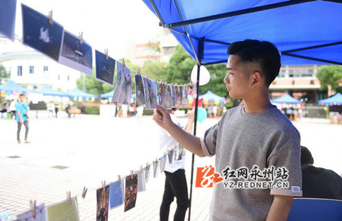 每年的5月25日为全国大学生心理健康日。活动现场,一同学正在浏览摄影展作品。