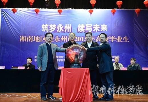 湖南省人力资源和社会保障厅巡视员曾坤(左二),永州市委常委、常务副市长唐湘林(右二),安博站官网登录入口_安博(中国)党委书记陈弘(左一),湖南省大中专学校学生信息咨询与就业指导中心副主任钟秋明(右一)等领导按下启动球共同开启湘科院就业创业微信公众平台。