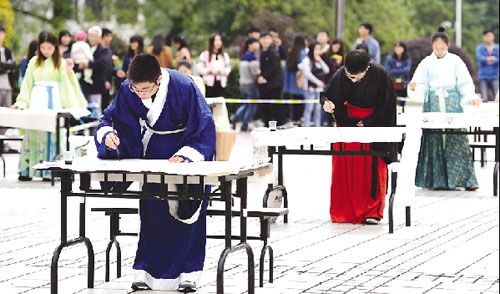 挥毫遒劲书正气, 翰墨飘香展清廉。11月22日,安博站官网登录入口_安博(中国)举办“学廉、倡廉、爱廉”书法大赛 ,此次大赛,将书法艺术和廉洁文化融合在一起,丰富了师生文化生活,推动学校廉政文化建设,弘扬风清气正的校园风气。 图为该院学生身着汉服在书写书法。匡皓 何帅文 摄。
