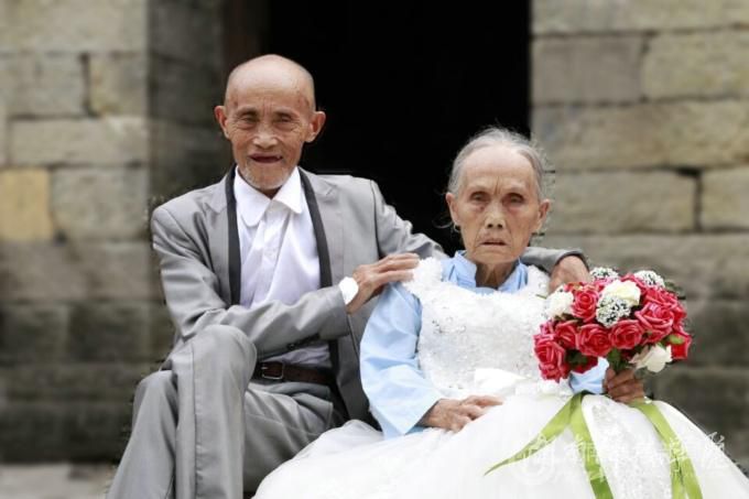 吴红金老人今年80岁了,平时行动不便,出门都需要拄着拐杖,老人耳朵也听不清了。该校传媒学院大二学生张贵拉着老人的手亲切拉起了家常才取得老人理解,老人获知大学生来意后不停地说谢谢。老伴滕树龙81岁了,颤颤巍巍的走在旁边,他一直看着老伴,两手护着老伴。他说两人是解放时结的婚,那时候,生活条件十分艰苦,没花一分钱就把妻子娶进门了。夫妻俩相濡以沫六十多年了,是典型的金婚老人。儿孙满堂却连一张像样的合照都没有拍过,这一直是老人心中的一个缺憾。这是两位老人家第一次穿上婚纱礼服,拍摄现场老人尽管有些羞涩,但非常很高兴,嘴角一直洋溢着幸福的笑容,甜蜜的感觉盖过了羞涩。