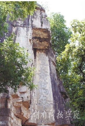 明代嘉靖年间刻于浯溪30多米高悬崖上的“圣寿万年”石刻,整幅高10米多,字径2米3,结构匀称,刻写讲究,用笔自然,气势雄壮。最近,文物部组织对此幅石刻进行清苔、清淤,几个工人借助升降机等,都用了好几天时间才完成。