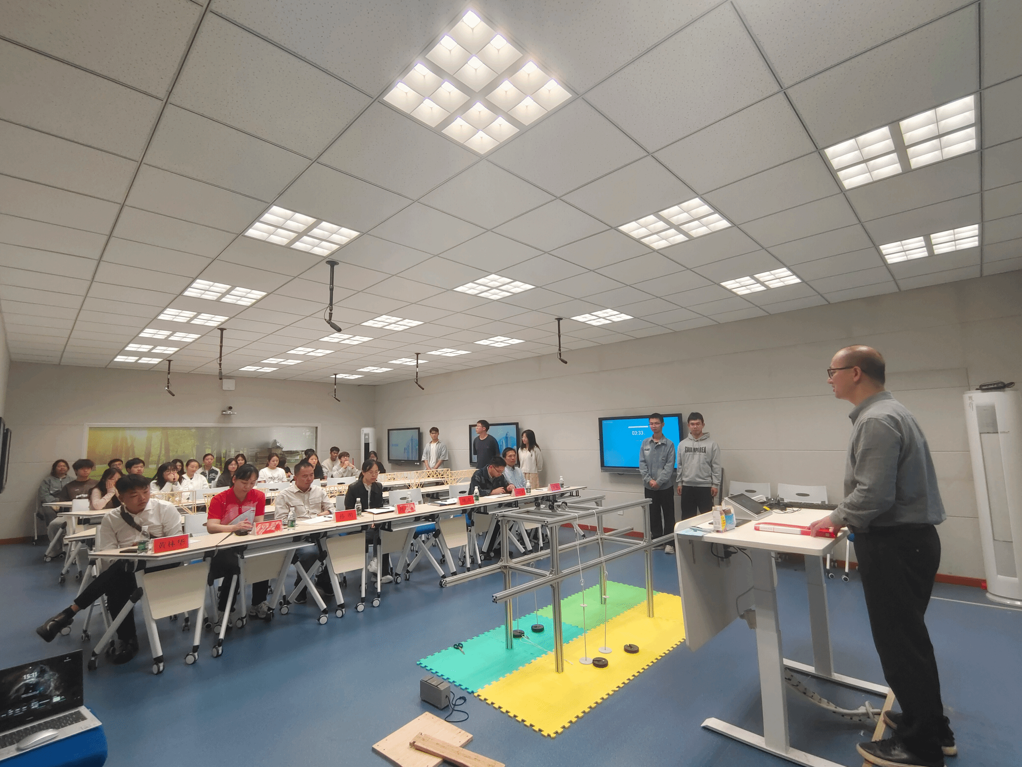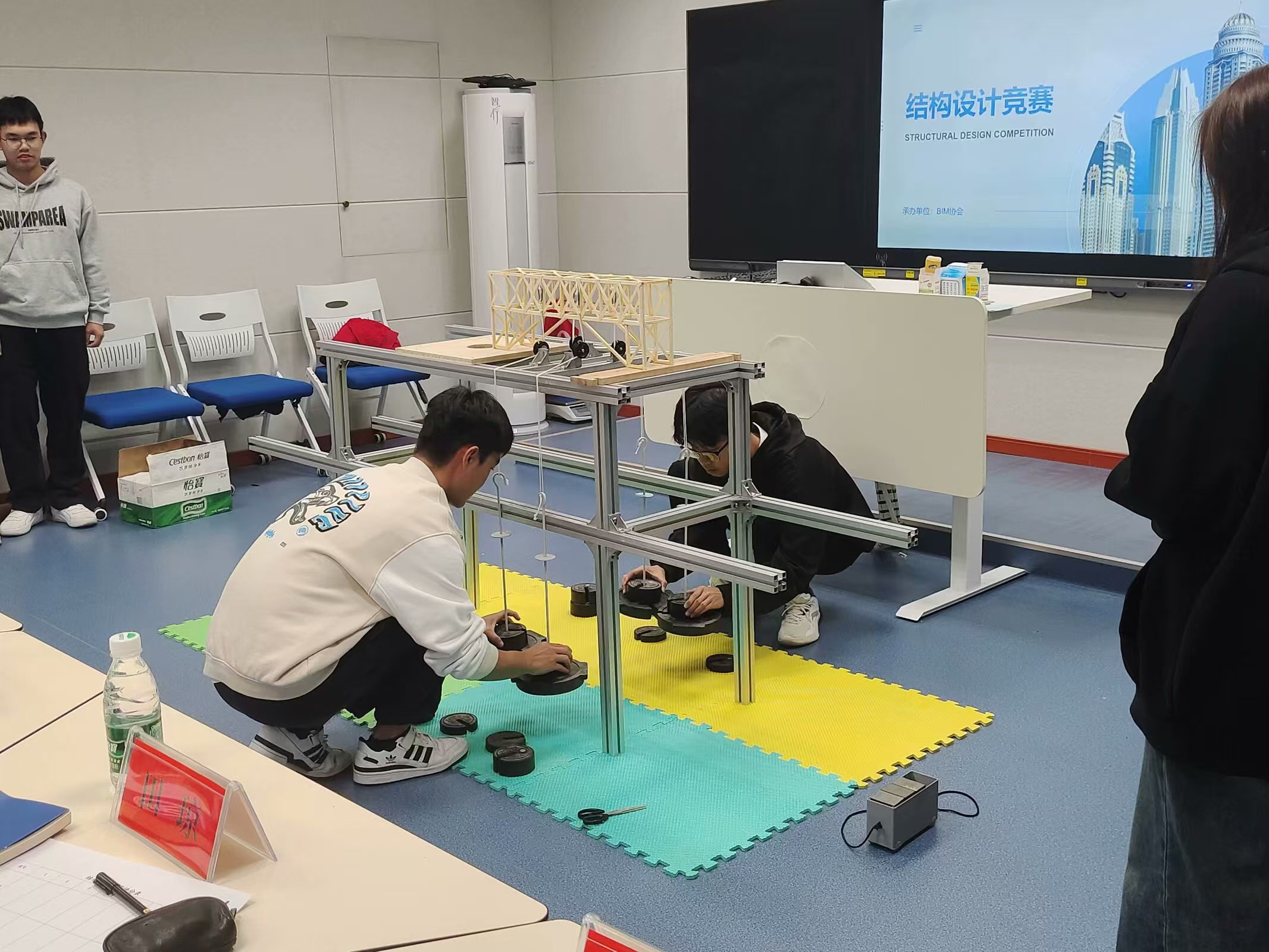 比赛活动中,各参赛小组成员以均布荷载和移动荷载下大跨度桥梁设计与制作主题进行了现场展示与加载试验。