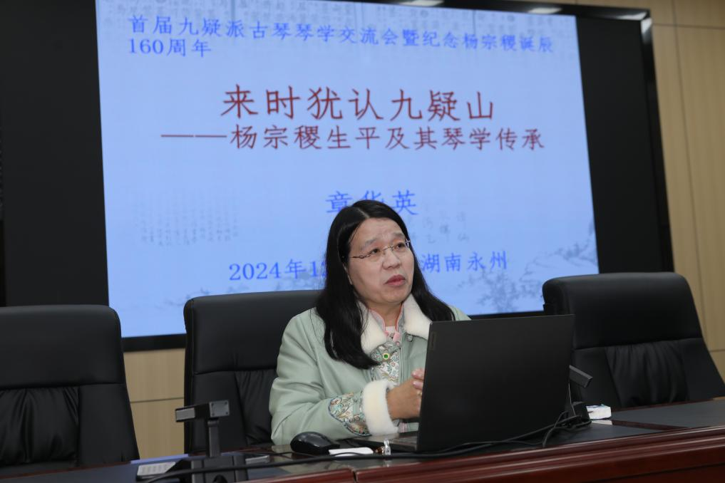 章华英教授以其深厚的学术底蕴和丰富的实践研究,不仅详细介绍了杨宗稷先生的家世与生平、古琴师承以及主要在湖南、山西、北京的古琴活动、《琴学丛书》的贡献等,还深入剖析了九疑派古琴的独特魅力与传承价值。现场还进行了互动交流,观众们纷纷提问,章华英教授一一解答,现场气氛热烈而融洽。