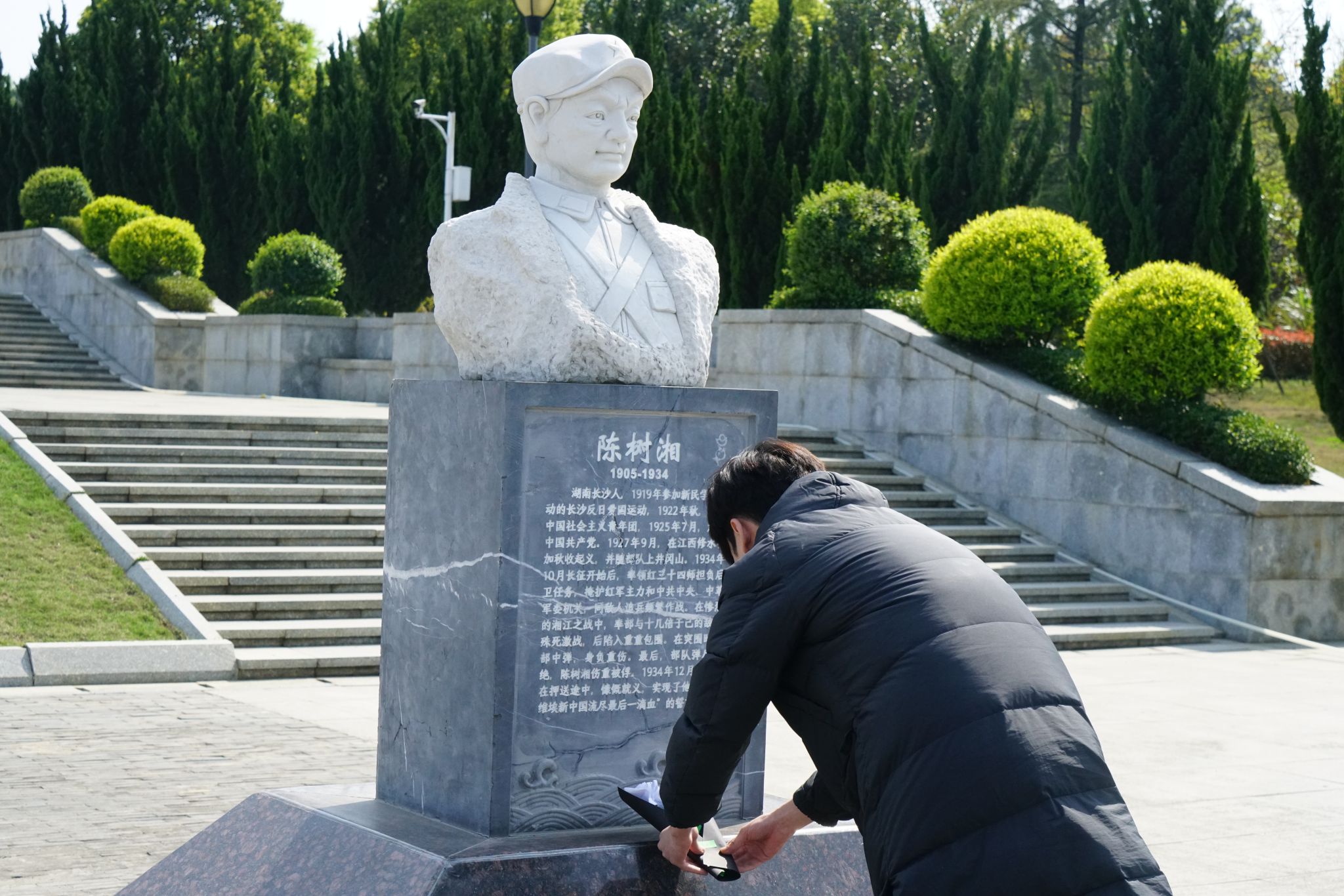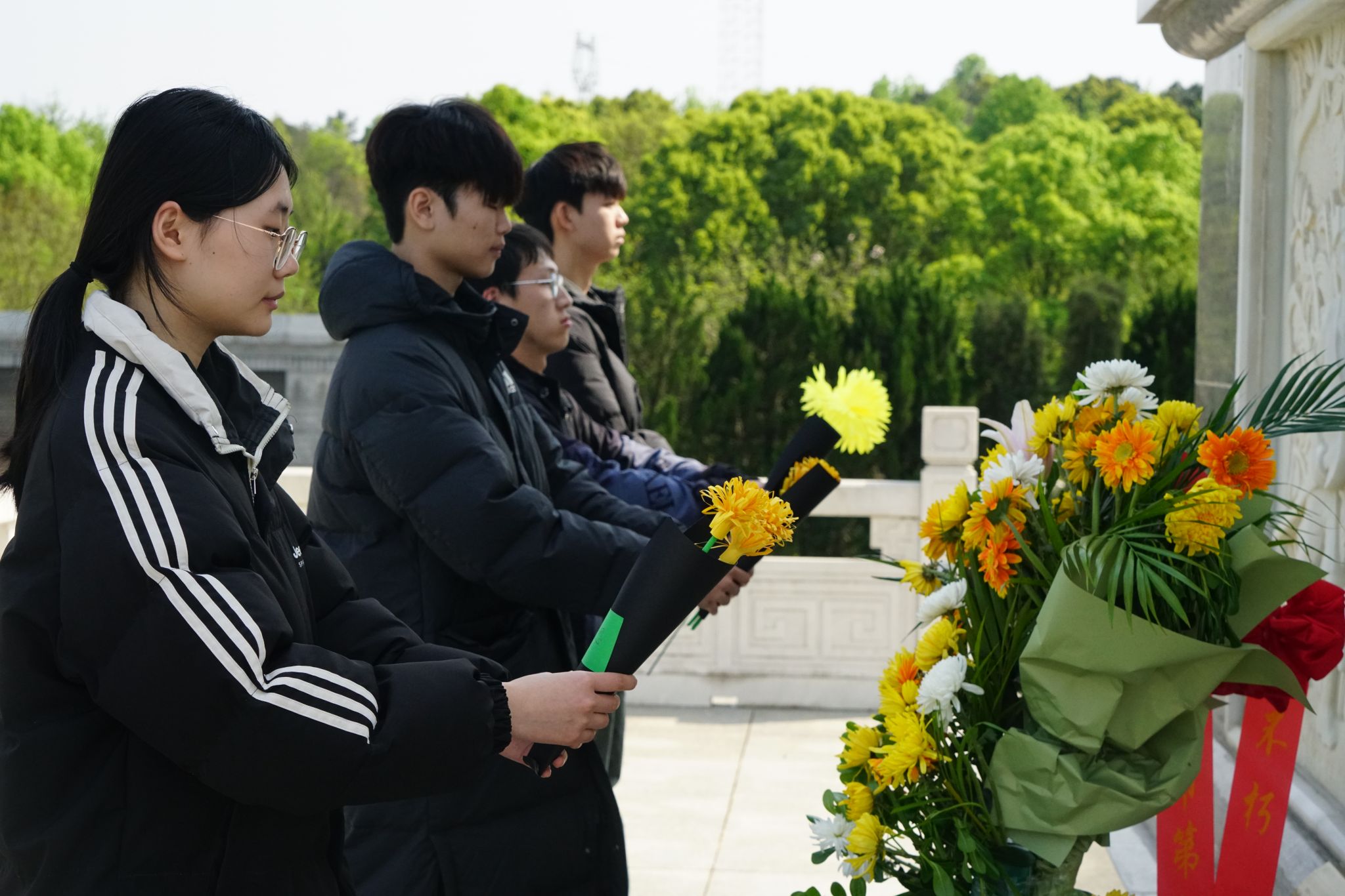 巍巍青山埋忠骨,朵朵“白”花祭英魂,在烈士纪念园,全体志愿者依次为陈树湘、何宝珍等烈士献上花束,并鞠躬默哀,表达对革命先烈的深切缅怀和崇高敬意。