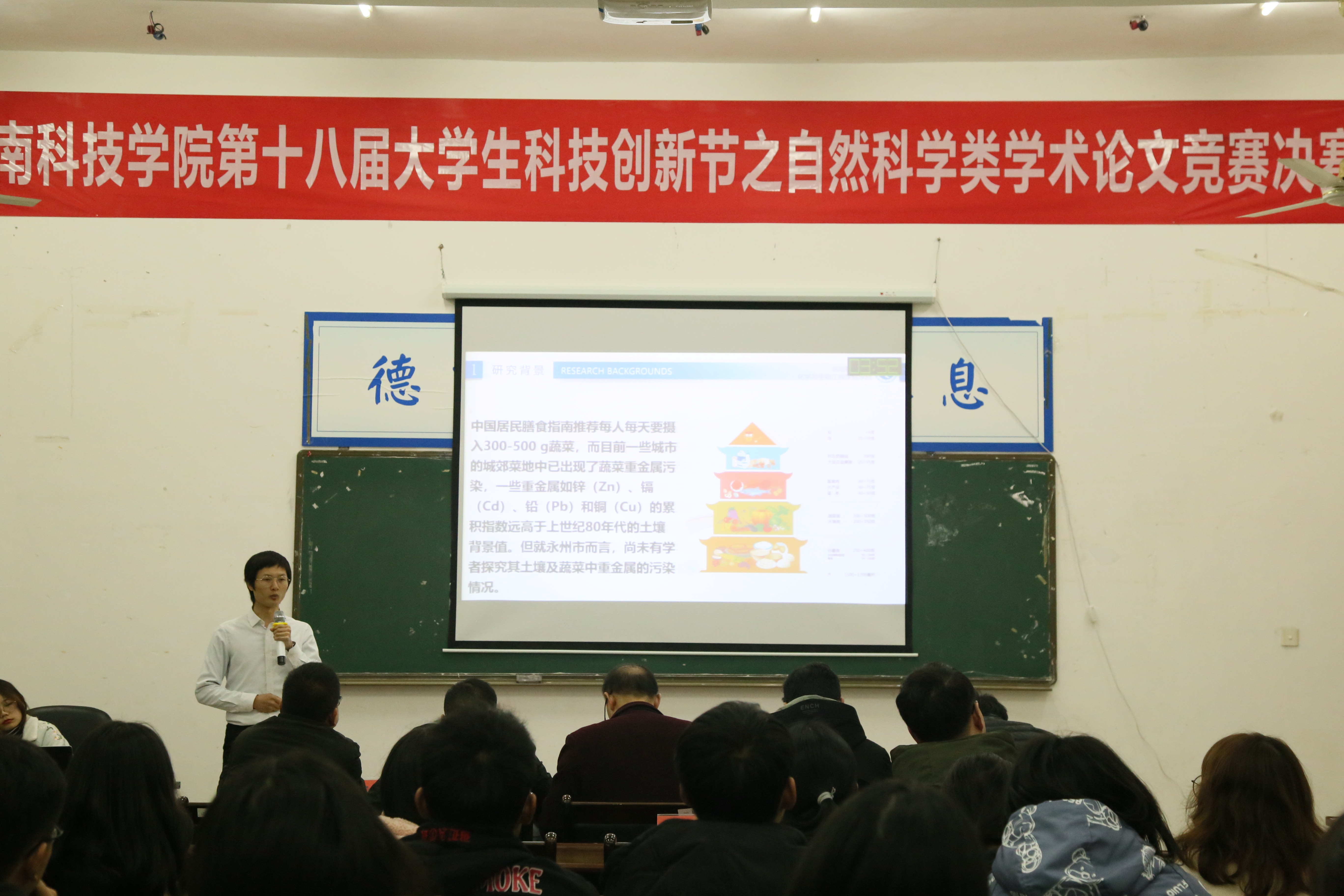 此次比赛共有来自全校十四支队伍参加。比赛中,各参赛团队从论文理论基础、论文主体结构、理论价值与成果应用等方面进行了精彩陈述,评委老师从论文的理论性及可行性进行提问并且给出了相关改进建议。最终,周耀小组《基于二肽骨架的苄醇凝胶的制备及其对有毒染料吸附性能的研究》荣获一等奖,肖芷诺小组《积分路径上有积点的反常积分计算研究方法》、吴宝玉小组《非光滑椭圆轨道约束问题的求解与分析》、陈宇龙小组《基于国密的数据库隐私检索》、王思思小组《永州薄荷精油成分分析以及其与异蛇蛇蜕浸液复配剂抑菌效果研究》荣获二等奖,胡文锋小组《江永香柚皮水溶性抑菌成分的提取及在六类食品中的应用》、邓邵文小组《基于单肽骨架的温室选择性凝胶剂的制备及凝胶剂性能研究》、王青豪小组《双岐杆菌CRISPR/Cas系统生物信息学分析》荣获三等奖,杨静芸小组《百合糯米甜酒加工配方的研究》等六组作品荣获优胜奖。