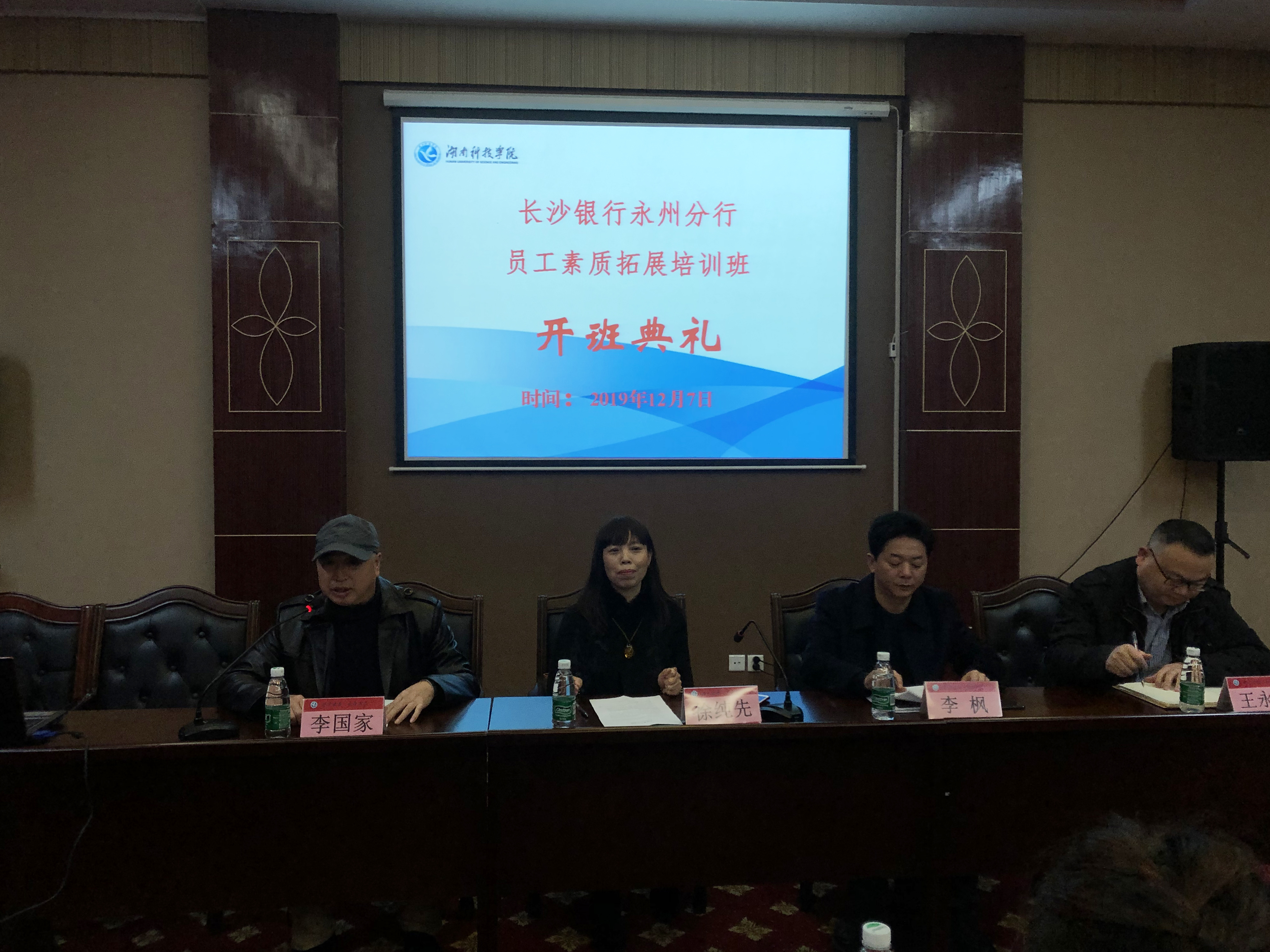 本网讯 12月7日至9日,长沙银行永州分行员工素质拓展培训班在我校举行。长沙银行永州分行行长、祁阳县村镇银行董事长李枫,继续教育学院院长徐纯先参加开班仪式。