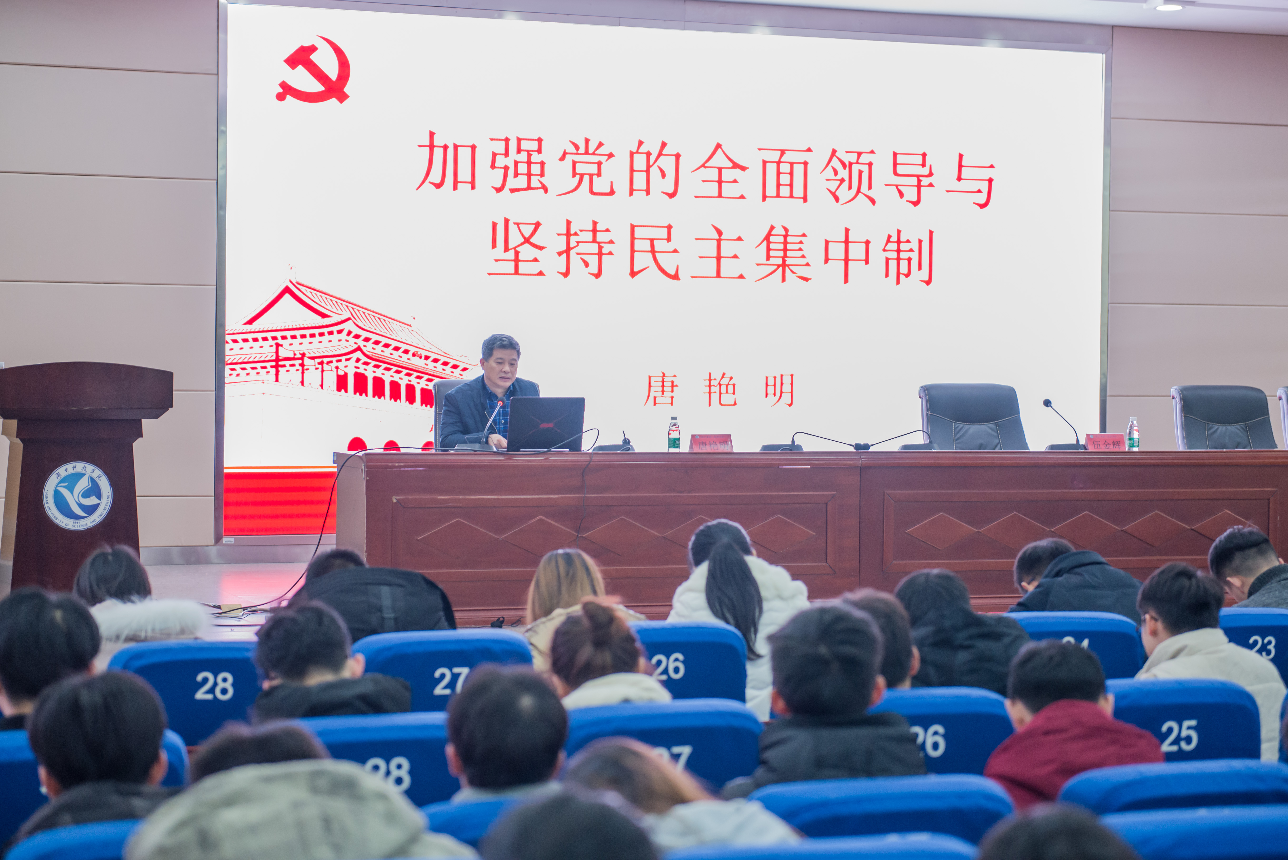 唐艳明以“加强党的全面领导与坚持民主集中制”为主题,从如何理解坚持和加强党的全面领导、民主集中制是加强党的全面领导的有效组织载体、正确理解民主集中制基本功能和基本内涵、民主集中制的重要原则和基本要求、如何贯彻落实民主集中制等五个方面进行解读。