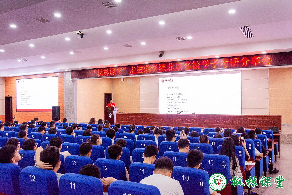 本网讯 5月26日晚,由校友办、北京校友会所属的枫林公益基金会共同主办的考研技巧分享会在潇湘大讲堂举行,校友办主任杨能山及来自各教学学院的600多名学生参加了活动。