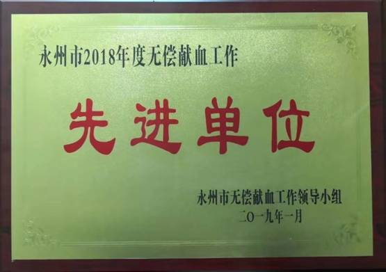 本网讯 近日,从永州市无偿献血工作领导小组传来喜讯,我校在2018年度无偿献血活动中,工作突出,荣获永州市“无偿献血先进单位”。