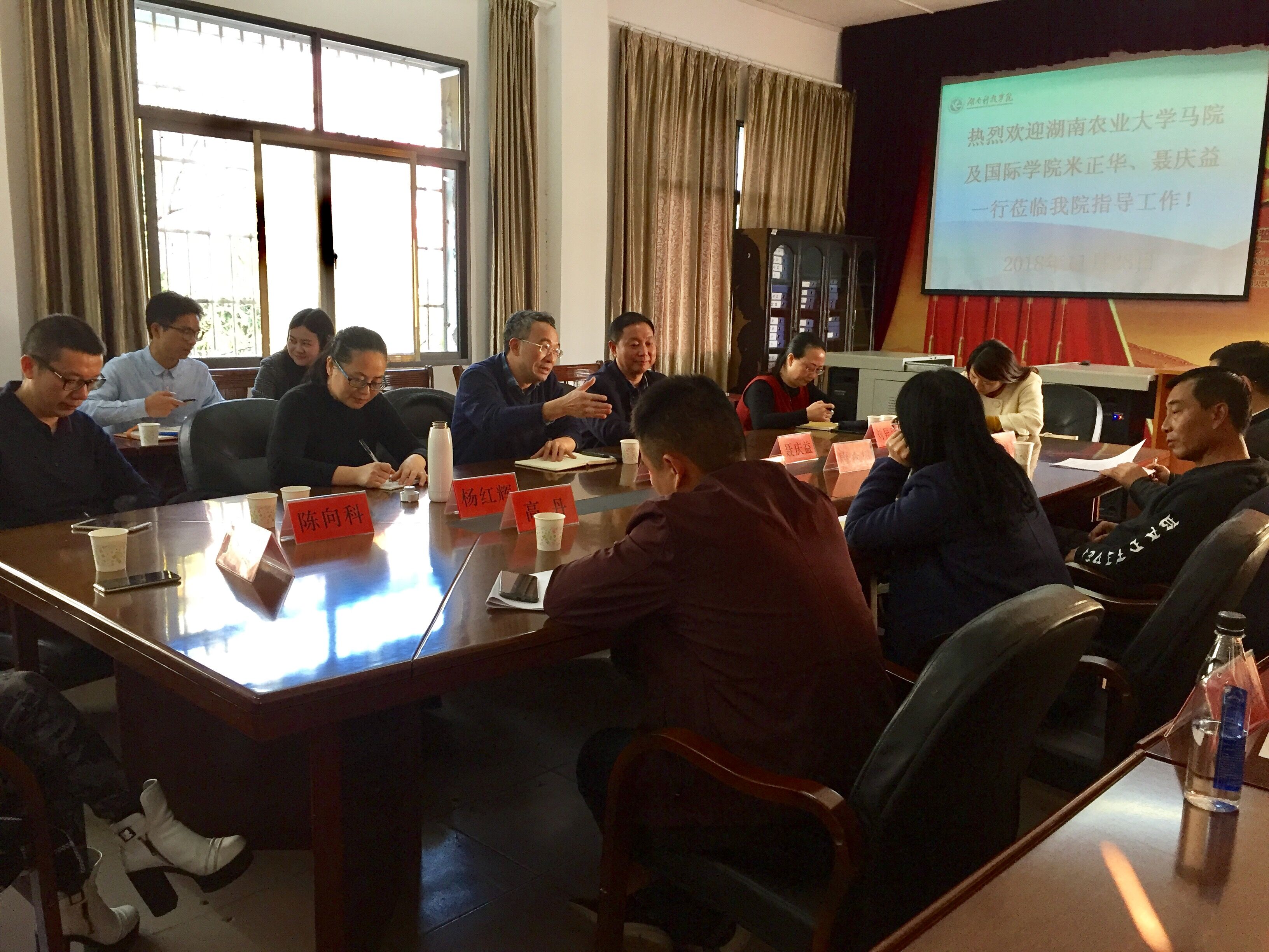 本网讯  12月28日下午,湖南农业大学马克思主义学院党委书记米正华及国际学院党委书记聂庆益一行9人来校就党建工作及党支部“五化“建设进行考察交流。马克思主义学院党总支班子成员及相关党支部委员参加交流。