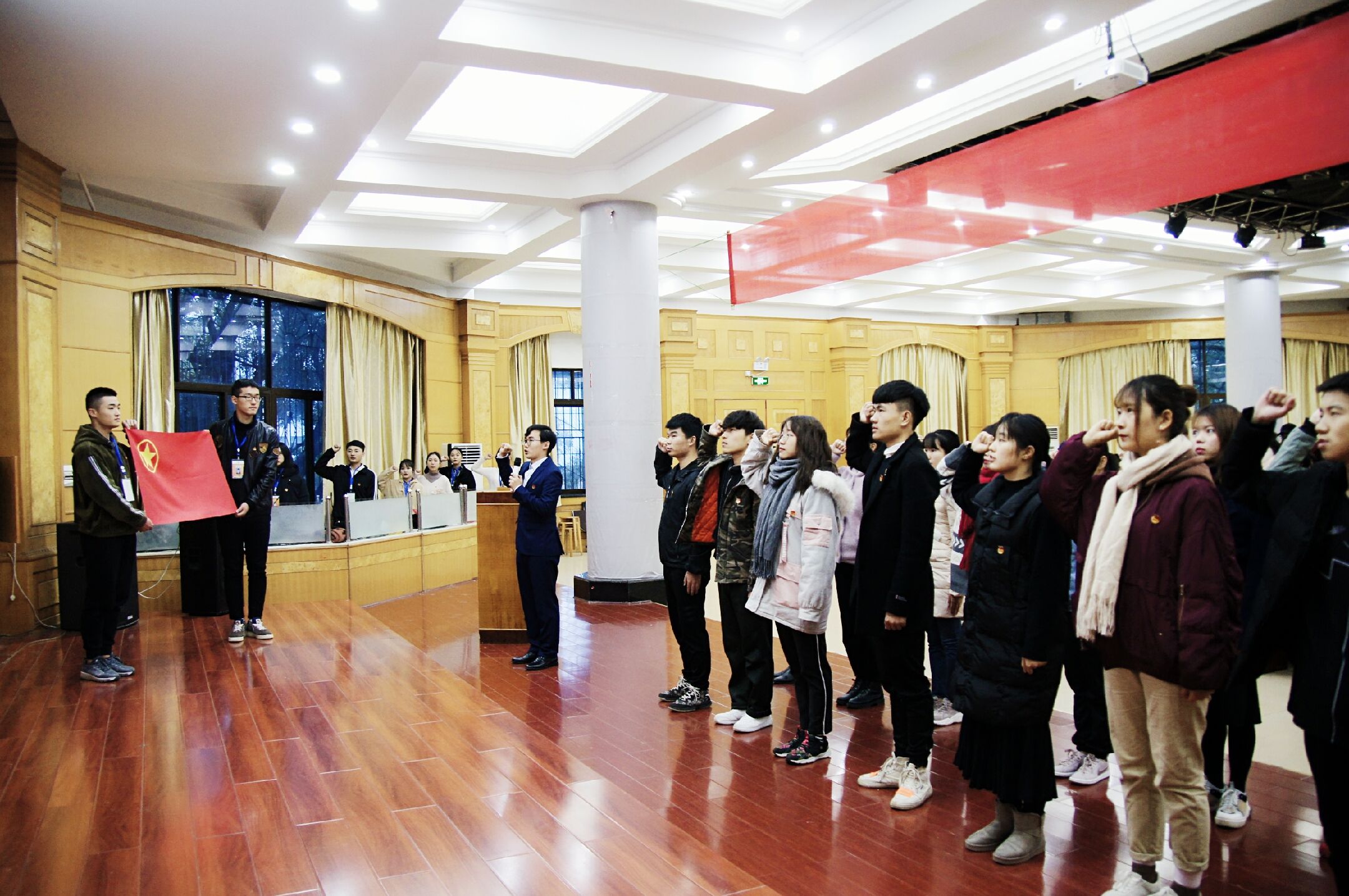 会上,校团委书记刘佳宣读关于成立安博站官网登录入口_安博(中国)学生社团联合会团总支以及大学生外语协会、党建协会、习近平新时代中国特色社会主义思想研究与实践协会等13个社团团支部的决定。程智开、刘佳为新成立的团总支和社团团支部授团旗,校学生社团联合会团总支书记陈鑫作为领誓人,带领全体与会人员重温入团誓词。