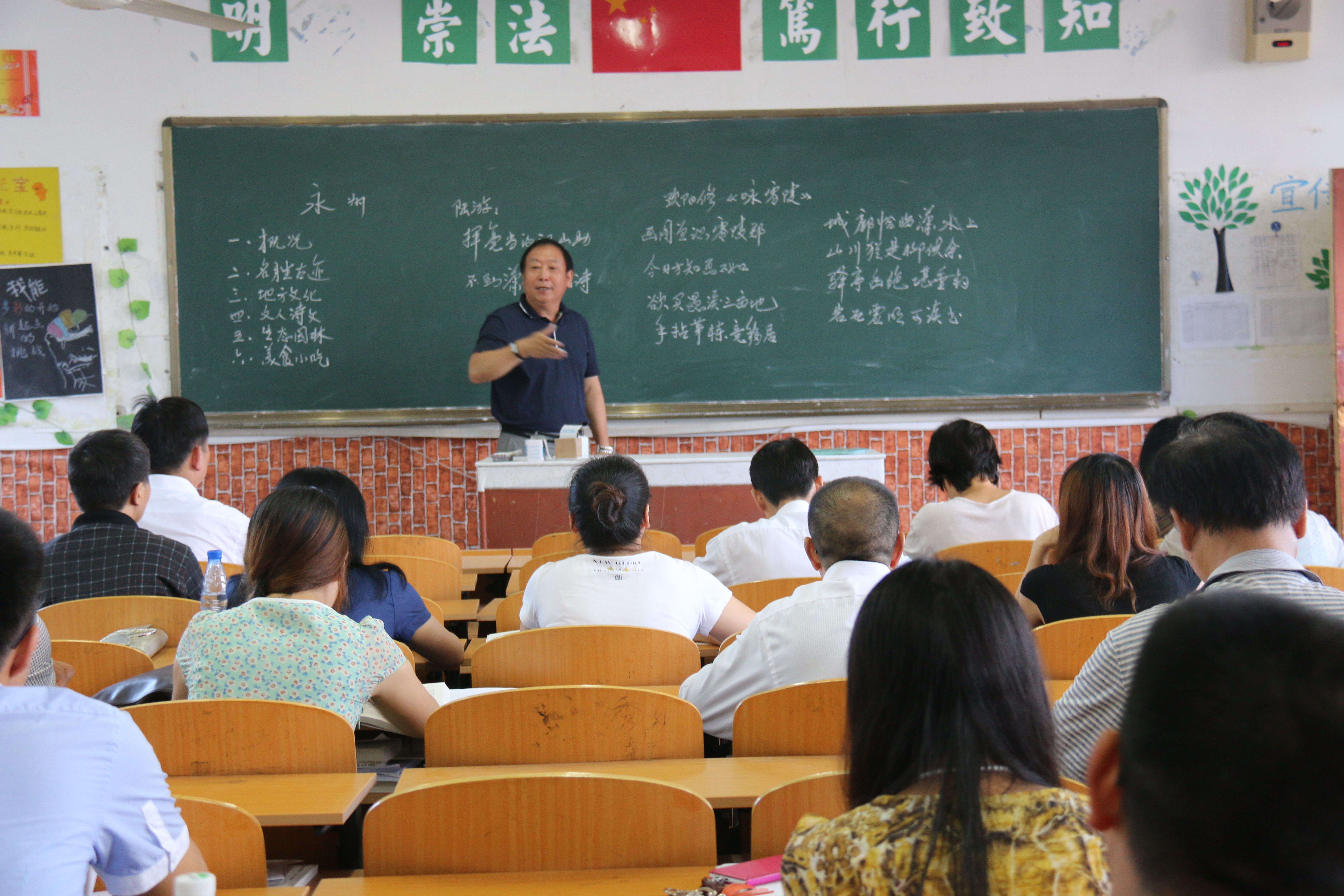 为了更贴近广大教师的日常教学,欧小松特意选择了非常普通的501教室上课。课上,欧小松首先以永州的“概况”、“名胜古迹”、“地方文化”、“文人诗文”、“生态园林”和“美食小吃”等为教学内容,上了两段“模拟课”:一段是传统“直白式”的教学,并以“文人诗文”为例,列举陆游、欧阳修等人的诗文,将永州的山水人文之美演绎得淋漓尽致;一段是探究式互动教学,将以上其他的教学内容布置给学生小组,一个组负责一项内容,在课后搜集文献资料并整合成课件,下次课由学生主讲。随后,欧小松由模拟课引出了两个观点:一是教学有法,教无定法;二是胸中有书,目中有人。至于第一个观点,欧小松指出,上课要抓住“课眼”,善于将各种“创意”运用到具体的教学中去,培养学生主动求知与求智的习惯和能力。关于第二个观点,他认为,老师尤其是博士、教授都做到了“胸中有书”,但要做到“目中有人”,所谓的“人”,即学生个体。他结合近期在教学督导过程中所遇到的问题,总结为五个“不等式”:老师讲得越多,学生学到越少;老师越勤快,学生越懒惰;老师越强势,学生越劣势;老师喜欢的,学生却反感;老师所忽视的,却是学生需要的。进而指出,要解决这五个“不等式”问题,教师必须做到“目中有人”,从学生的角度与需求出发,思考适合学生的教学方法,讲授学生能接受的专业文化知识,做到“以学思教,以学定教,以学评教”。