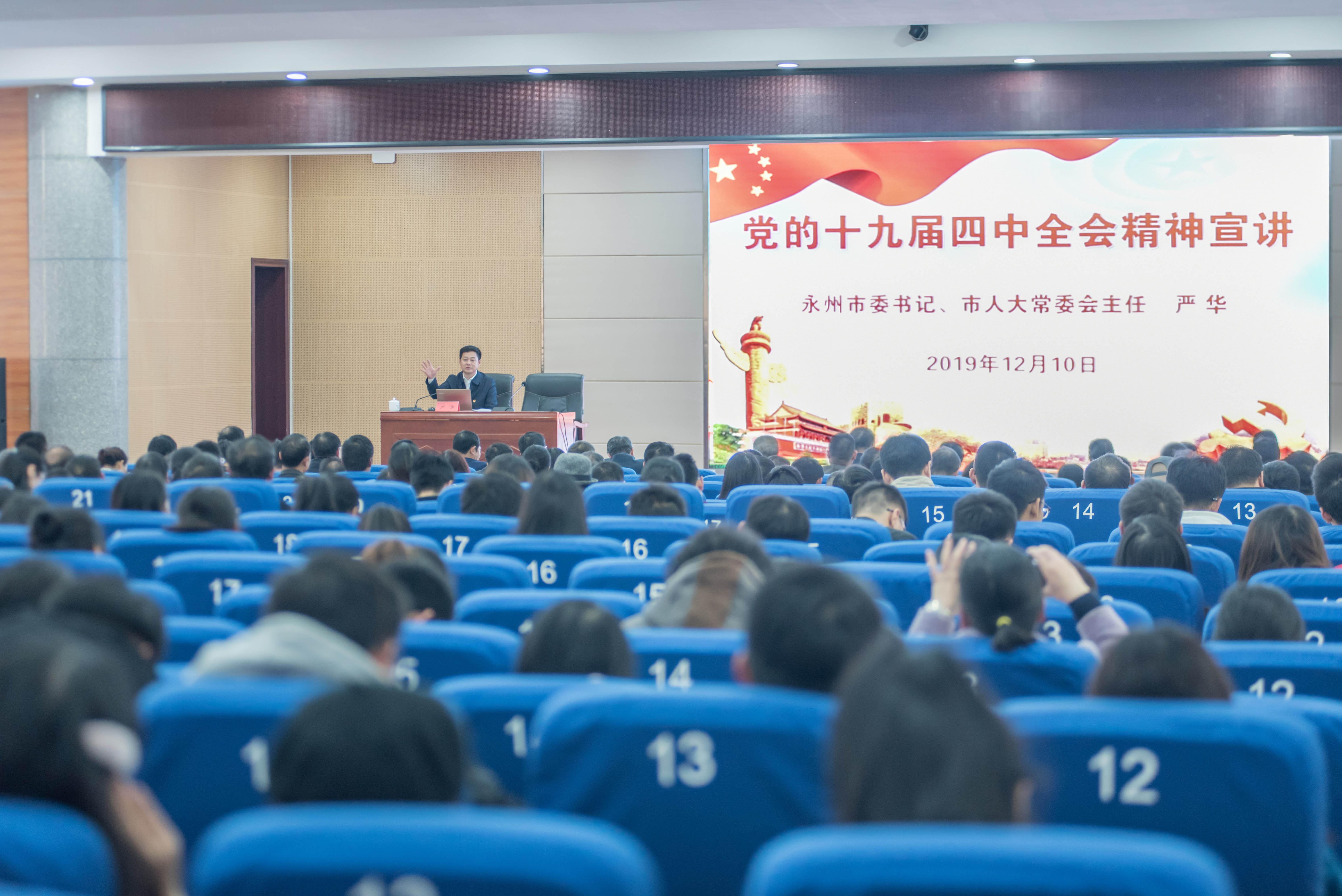 本网讯 12月10日下午,省委宣讲团来校宣讲十九届四中全会精神。省委宣讲团成员、永州市委书记、市人大常委会主任严华作宣讲报告。市委常委、市委秘书长唐能武出席,党委书记曾宝成主持报告会,校长李钢,校领导唐艳明、宋宏福、彭立威、李常健、吴小林、程智开和600余名师生代表参加报告会。