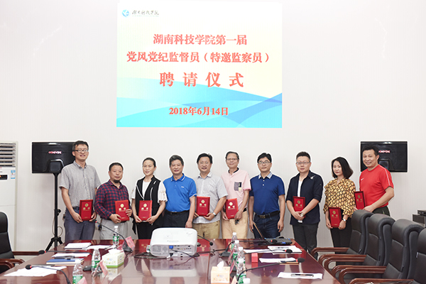 为贯彻落实全面从严治党要求和《关于支持民主党派和无党派人士开展政党协商和民主监督的实施办法》(湘科院党政办通〔2017〕58号),实现监督监察全覆盖,学校从校内民主党派和政协委员中遴选聘请党风党纪监督员(特邀监察员),以进一步强化民主监督和民主管理。6月14日下午,学校举行聘请仪式,何林金、于皓、王豪才、徐湘勇、周飞战、孔永红、汤亚平、吴迪等8位教师受聘。校党委副书记唐艳明、纪委书记彭立威为受聘人员颁发聘书并讲话。