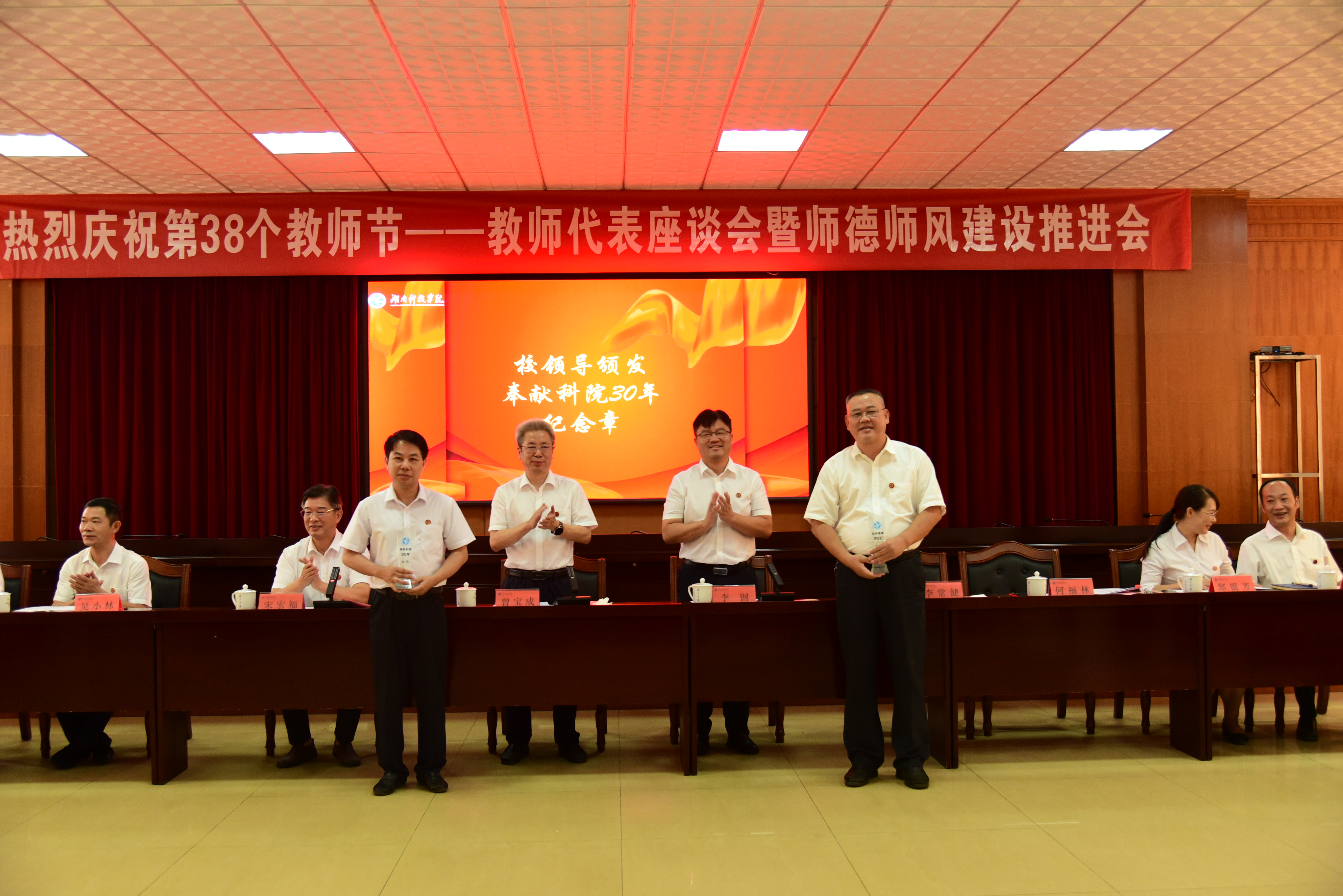 党委副书记宋宏福宣读“奉献科院30年”教职工名单。校领导为奉献科院30年的教职员工颁授“奉献科院30年”纪念章。曾宝成,李钢分别为副校长李常健、何福林颁授“奉献科院30年”纪念章。
