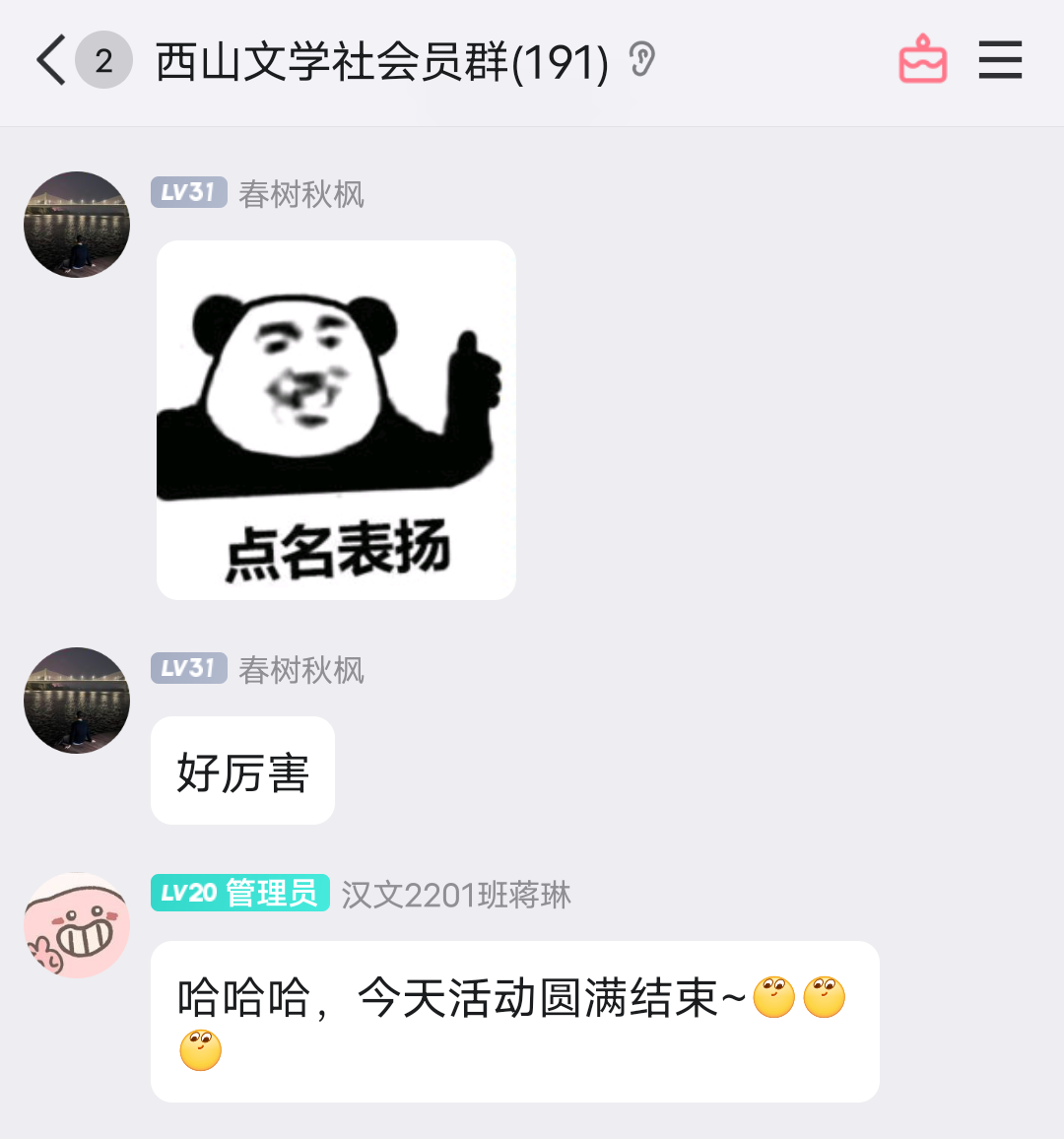 多位会员在活动结束后表示意犹未尽,表达了本次常规开课形式改革的成功。活动结束后,文学社领导层积极进行反思,常规开课的形式不能局限于单一的一种,我们应该及时倾听会员的评价,让活动举办得生动有趣,而不是应付形式的千篇一律。让会员满意,更要在开课中体现文学社的内涵,一次成功的开课会让大家有所收获。