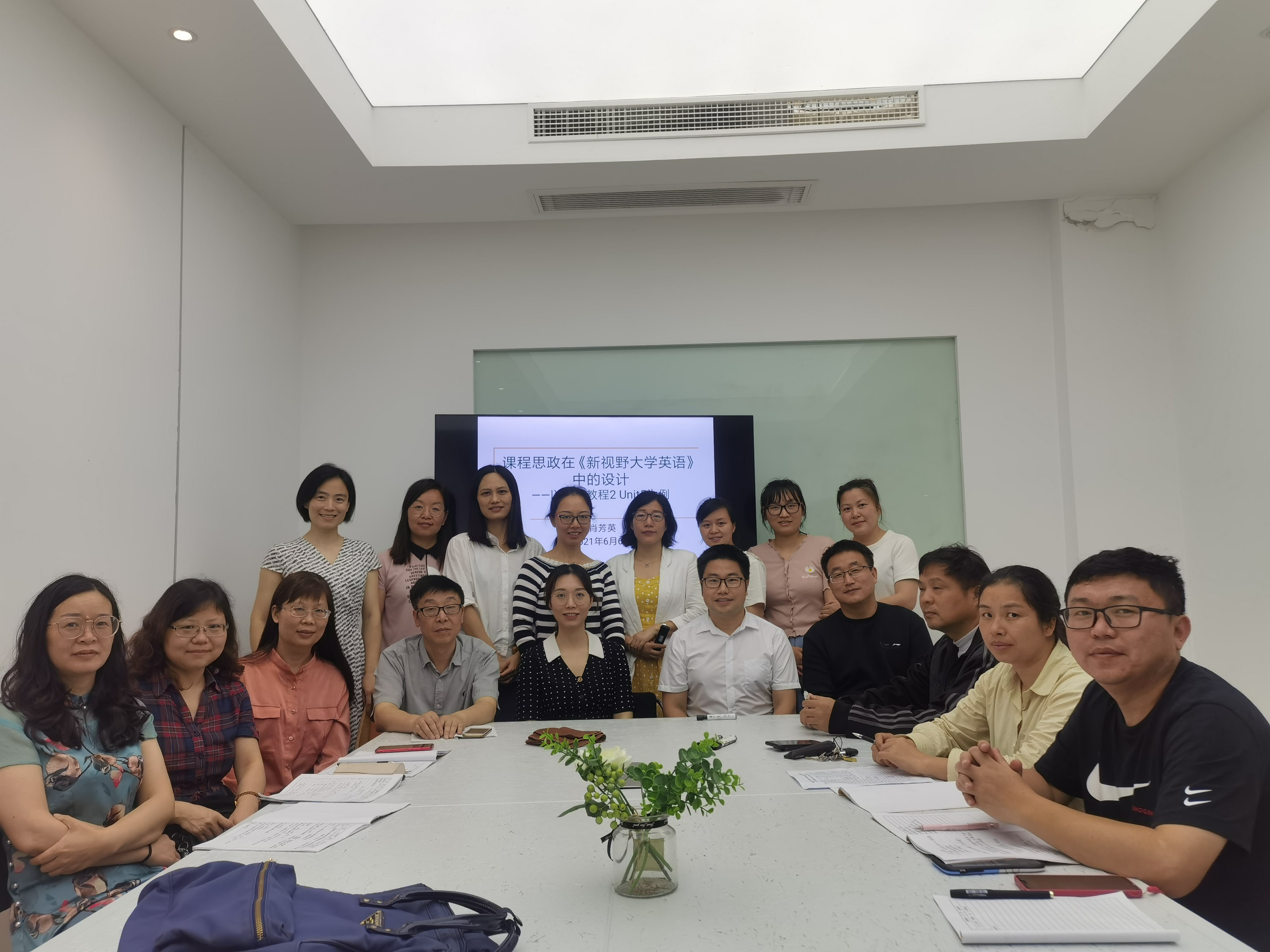 6月1日下午,外国语学院公共教学部肖芳英老师在创客工场主持了“课程思政在《新视野大学英语读写教程》与《新视野大学英语视听说教程》中的设计”的教学研讨活动,公共英语教学部20余名教师参加了本次研讨会。