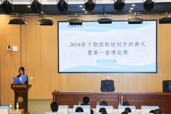 (通讯员 李嘉慧 摄影 欧玉莹)10月21日晚7:10,外国语学院于博雅楼东三报告厅召开2024年下期团校培训开班典礼暨第一堂理论课。外国语学院党总支副书记罗晶、学工办副主任、24级辅导员王素芳,团总支书记、23级辅导员李政锴,团总支学生副书记陈玄烨、学生会主席刘玉纯、青年志愿服务团团长李丹、学生第二党支部负责人李帆出席本次开班典礼。