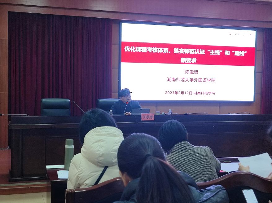 2月14日,陈敏哲教授以《英语师范专业二级认证现场考查面面观》为题,为英语师范专业认证工作核心小组作专题培训。他从专家组进校考查目的和任务、考查重点、现场考查的关注点等方面进行讲解,并就认证材料准备等具体工作进行了详尽指导。