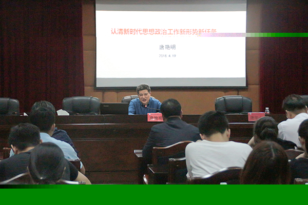 唐艳明以“认清新时代思想政治工作新形势新任务,开创我校思想政治工作新局面”为主题,紧紧围绕党的十九大报告和习近平总书记在全国高校思想政治工作会议上的重要讲话精神,从深刻理会新时代高校思想政治工作新精神新要求、准确把握新时代高校思想政治工作新形势新挑战、认真落实新时代高校思想政治工作新使命新任务三个方面作了精彩的辅导报告。
