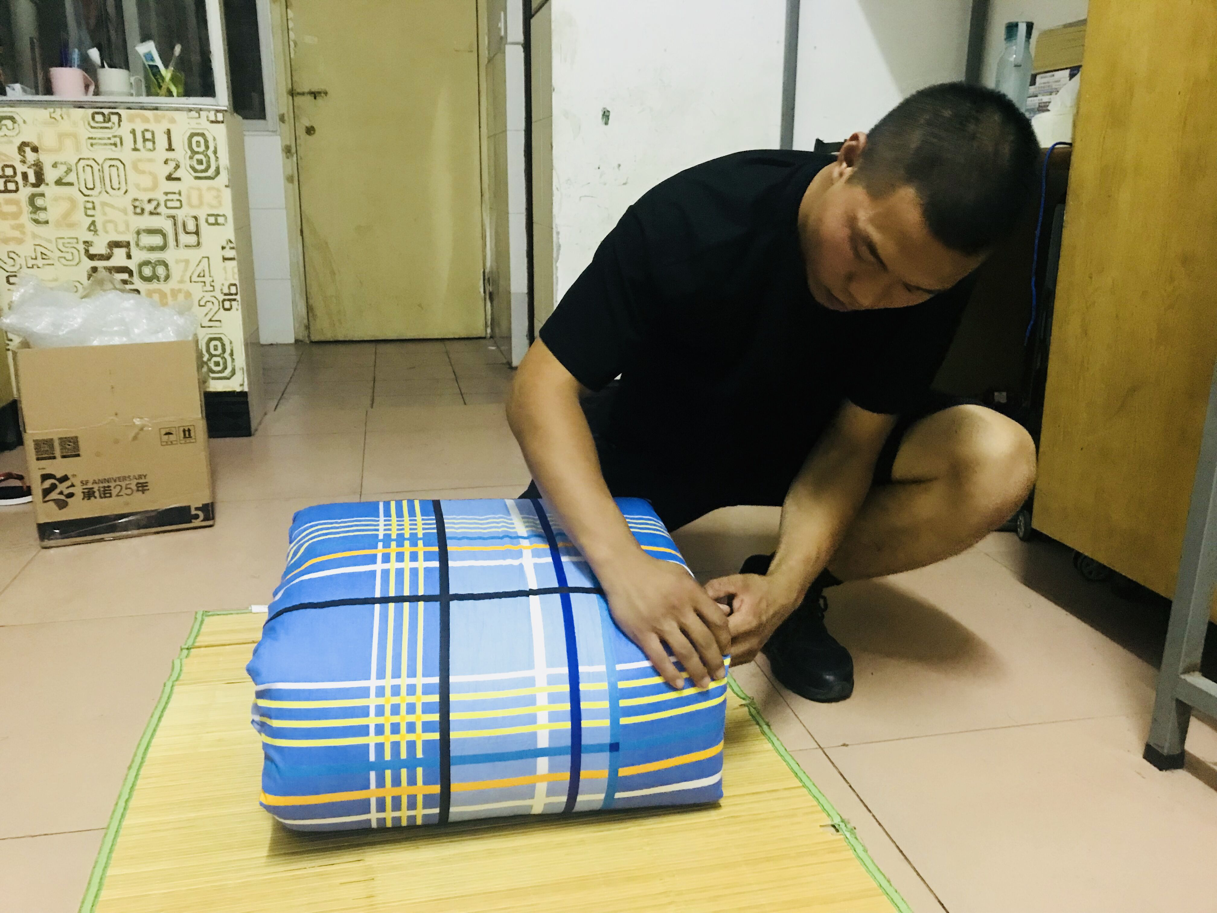 晚上,2015级退伍学长李向阳来到新生宿舍,手把手详细地教导2018级新生如何叠出整齐的军被。学长一遍又一遍地讲解和示范,新生们也在周围认真地学习。学长为同学们演示了叠好军被的几个步骤并进行了详细的分步讲解,经过虚部掏平、压平、两次对折等步骤,一个标准的“豆腐块”便完美呈现在同学们面前。而后,同学们谨记叠军被要领,严格按照步骤,经过几次练习,一个个豆腐块出现在学生面前,同学们都露出欣喜之色。