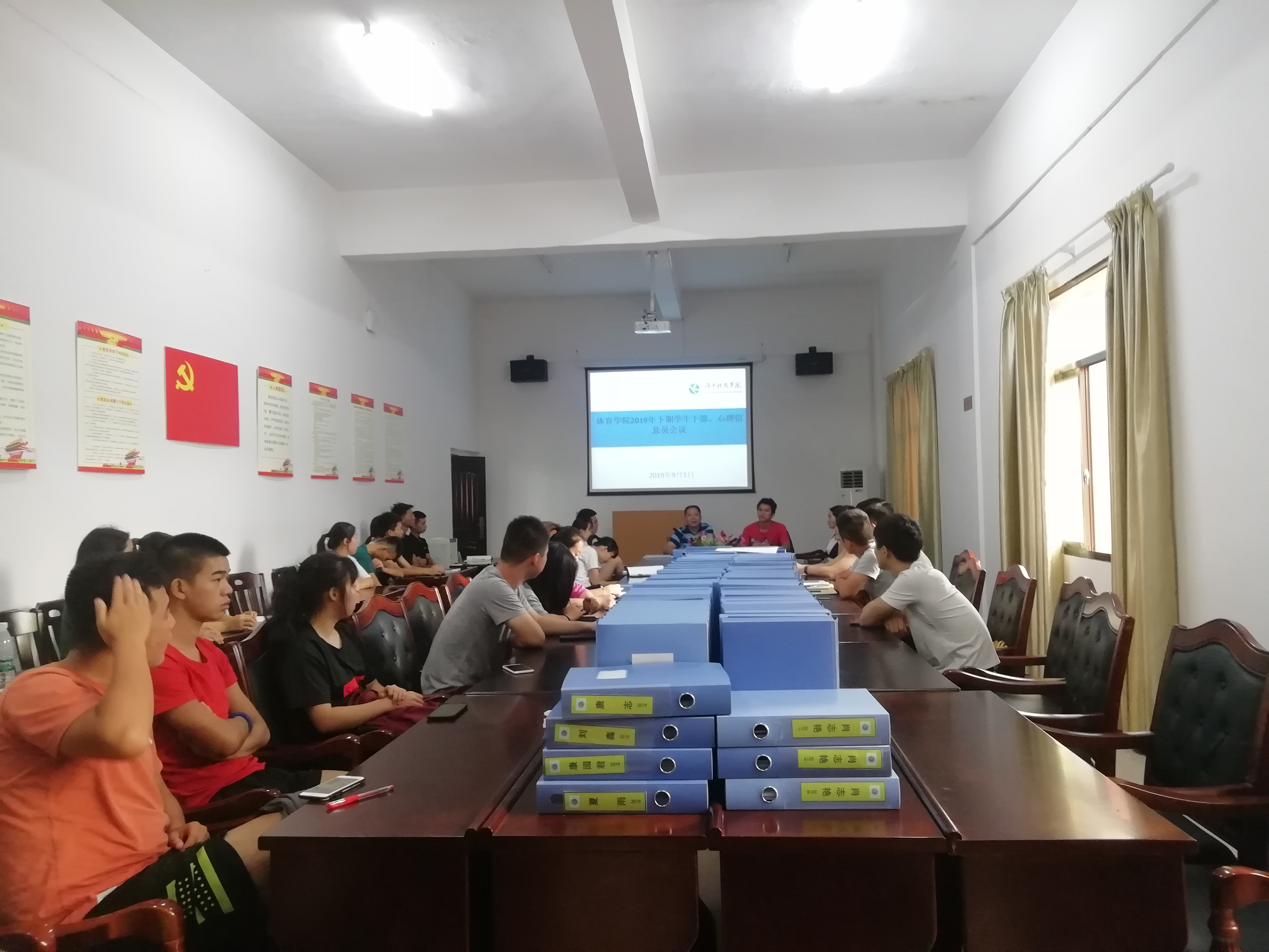 本网讯(张雪清)9月1日下午,我院在训练馆四楼会议室召开体育学院2019年下学期学生干部、心理信息员会议。院党总支副书记李红云、辅导员陈小峰、黄婉及我院全体学生干部和心理委员参加了会议,本次会议由陈小峰主持。