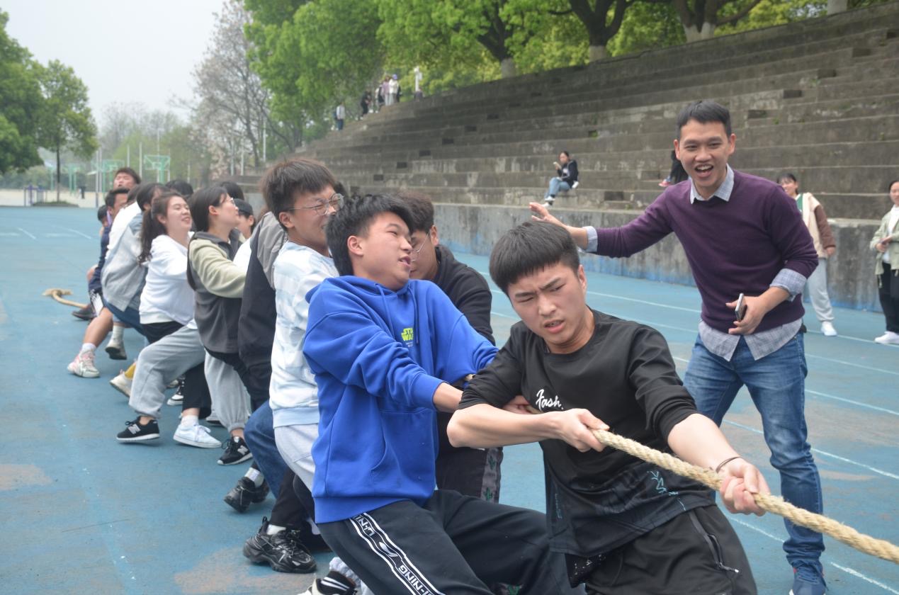本次比赛采用淘汰制与循环制相结合的形式展开,以班级为单位每队10男10女参赛。比赛中参赛队员双手紧握长绳,团结一心。啦啦队则在一边为参赛选手高喊“加油”,呐喊声响彻云霄。