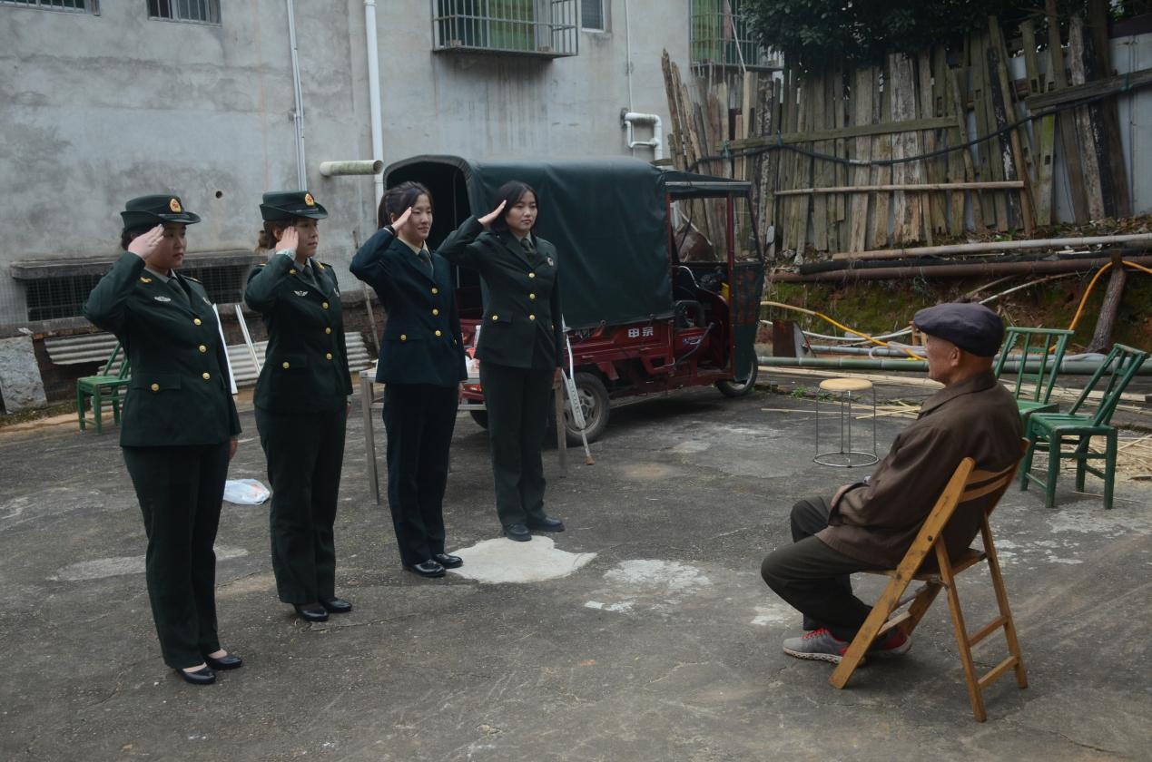 “爷爷您好,我叫陆燕,我是19年参军入伍的,在战略支援部队服役2年”、“我是杨新花,我叫莫寒,我们在陆军服役”、“爷爷好,原中国人民解放军火箭军96715部队上等兵田甜,向您敬礼”。在老兵家中,四名退伍大学生士兵围坐在他们身边,向他们汇报自己的参军入伍经历和现在部队里的变化。