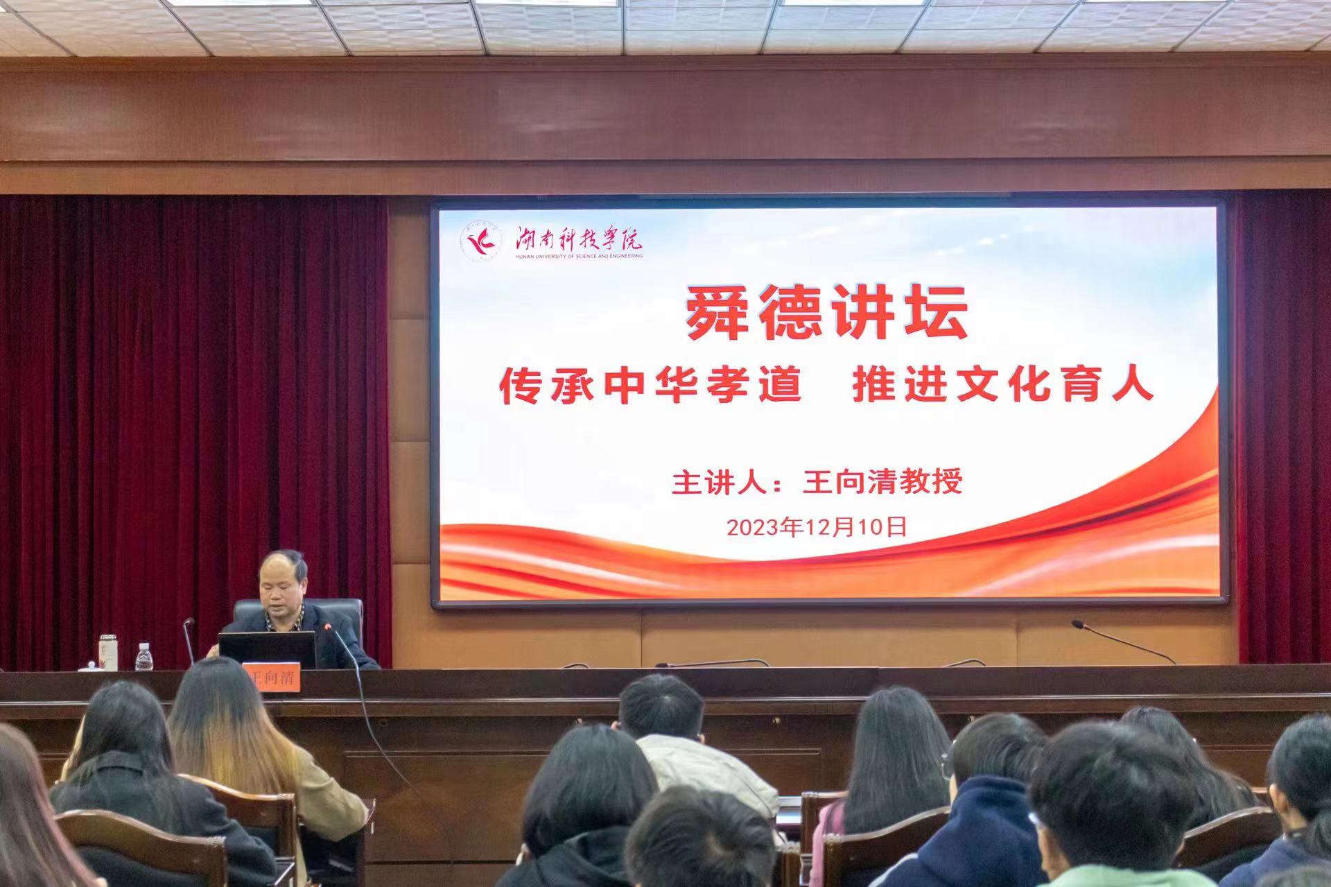 本网讯(李淑眉谢雨晴)“忠孝传家久,诗书继世长”,作为中华传统文化的基石,“孝道”以其特有的魅力一直被视作中华文明中的瑰宝。为弘扬中华优秀传统文化,增强学生的社会责任感,学校开设舜德讲坛,邀请专家学者来校讲学,12月10日上午,湘潭大学马克思主义学院王向清教授做客舜德讲坛开讲,学生工作部部长谷利民主持讲座。