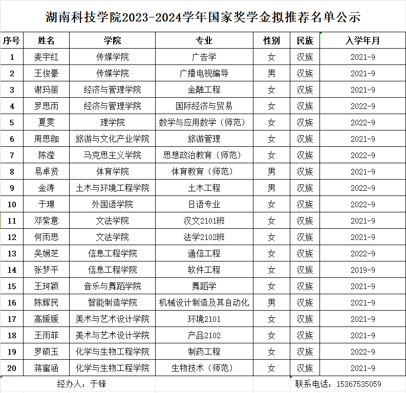 根据湖南省教育厅等5部门关于印发《湖南省学生资助资金管理办法》的通知(湘财教〔2022〕13号)、湖南省学生资助管理中心《关于做好2024年普通高校国家奖助学金评审工作的通知》(湘学助〔2024〕30号)文件要求和《安博站官网登录入口_安博(中国)学生奖励办法》、《安博站官网登录入口_安博(中国)学生资助管理办法》、《安博站官网登录入口_安博(中国)国家奖学金、国家励志奖学金、国家助学金管理办法》有关规定,学工部于2024年9月25日召开资助专干会议,安排部署评奖工作。经学生个人申请,各学院初审、公示,学工部审核。拟推荐化学与生物工程学院蒋蜜涵等20名同学参评2023-2024学年国家奖学金。