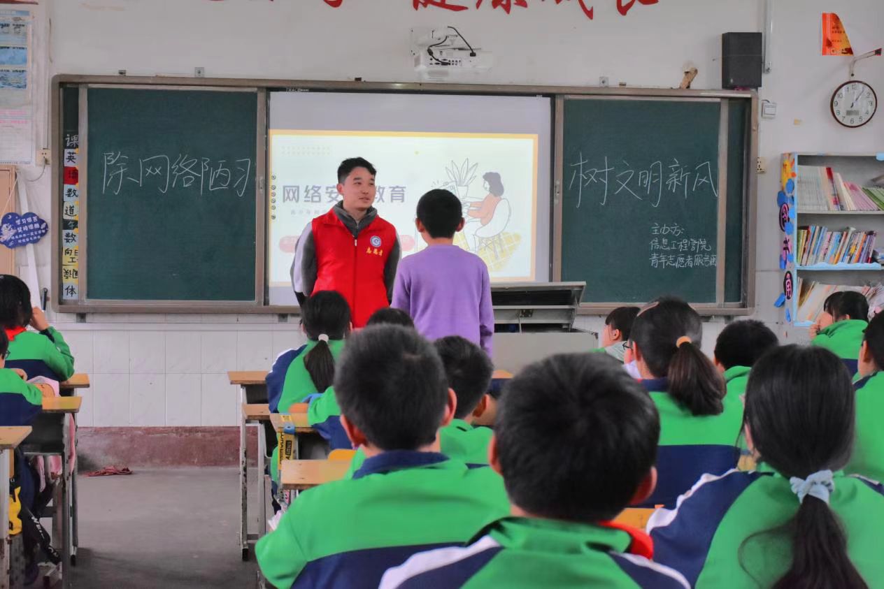 本网讯(通讯员 李玉娇 刘兵兵) 为了普及中小学生信息网络安全知识,营造良好的网络氛围,加快建设网络强国。我院青年志愿者服务团于3月24日走进杨梓塘小学举行“乡村信息技术课堂”活动,为六年级的小朋友上了一堂信息安全课。
