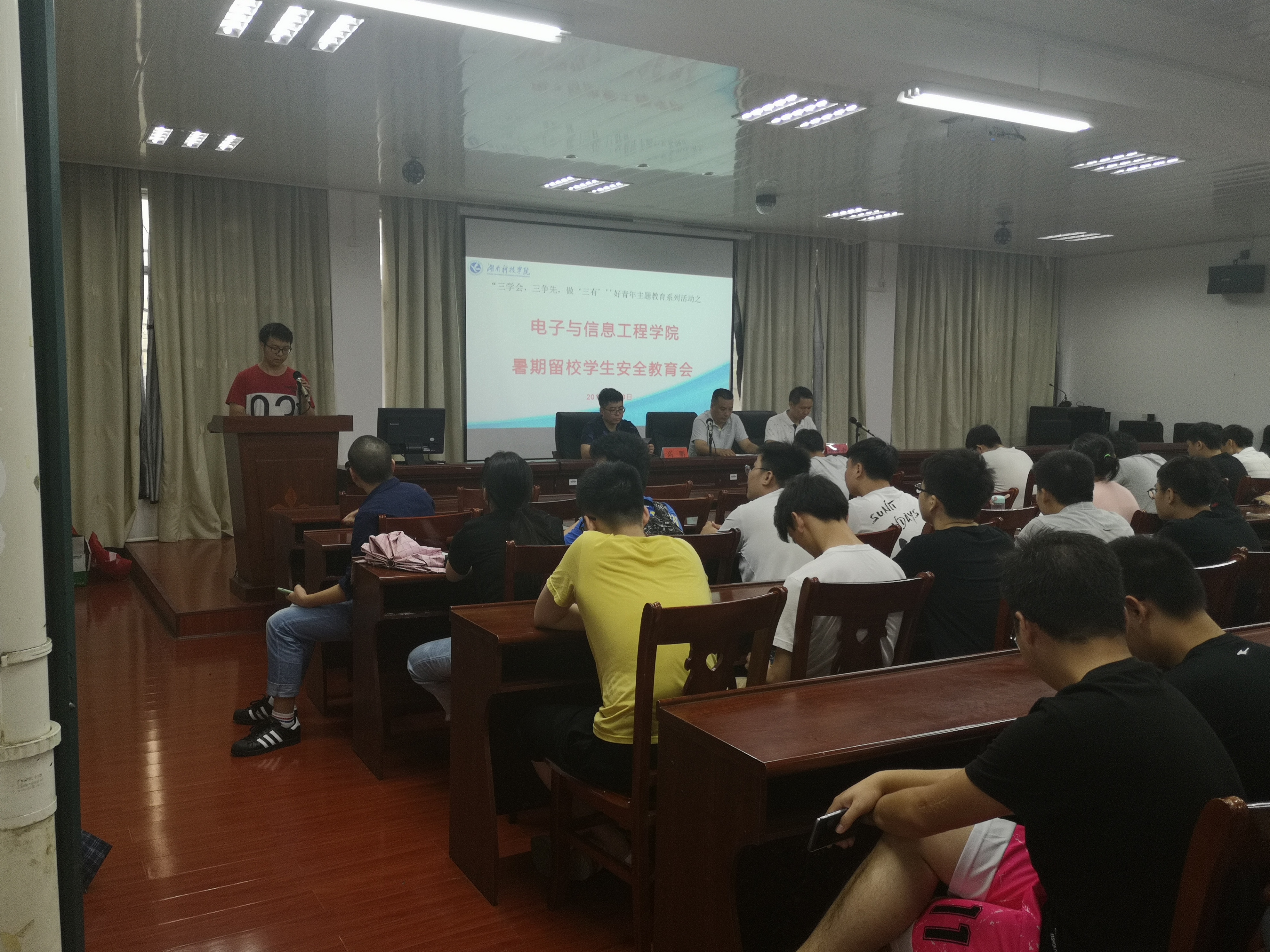 7月8日中午,我院于知行楼107召开暑期留校学生安全教育会议。党支部副书记李连胜老师、创新创业实验室主任杨振南以及学工办副主任高鹏老师到会,全体留校学生参加。