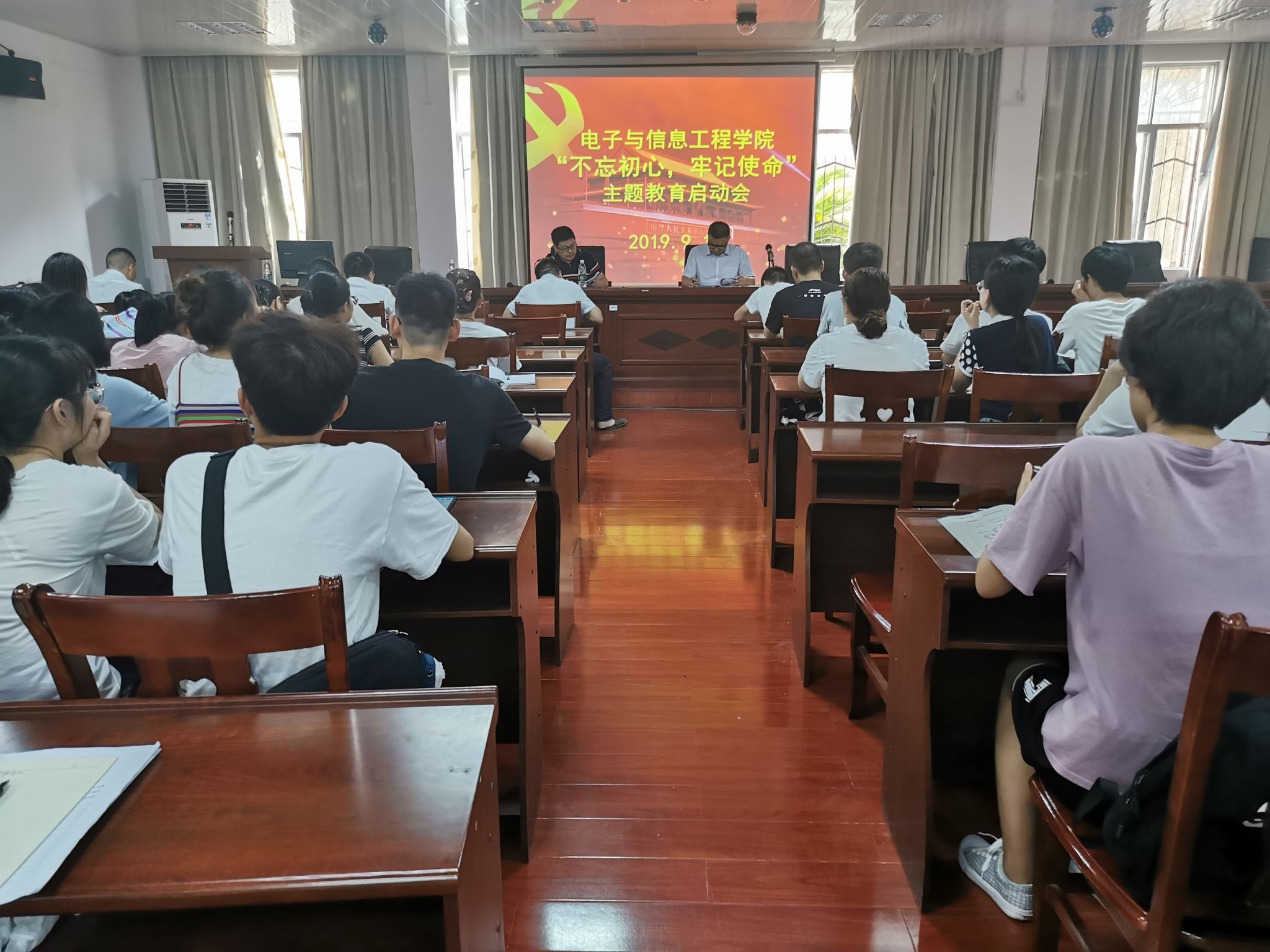 9月12日下午四点,电子与信息工程学院于知行楼107举行了“不忘初心,牢记使命”主题教育启动会。参加启动会的有党总支书记陈泽顺,院长尹向东,副书记李连胜,以及电信院全体党员。会议由尹向东院长主持。