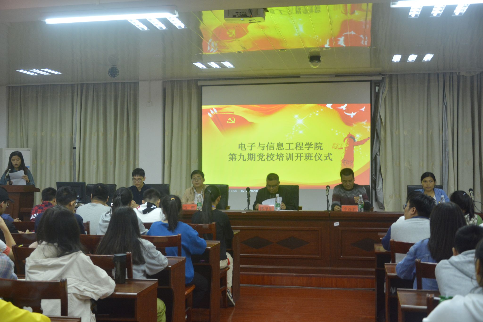 10月8日晚7点,我院于知行楼107举行第九期党校培训开班仪式。参加仪式的有党总支书记陈泽顺、副书记李连胜、高鹏、郭洱鹏和杜丹蕾老师以及66名入党积极分子。