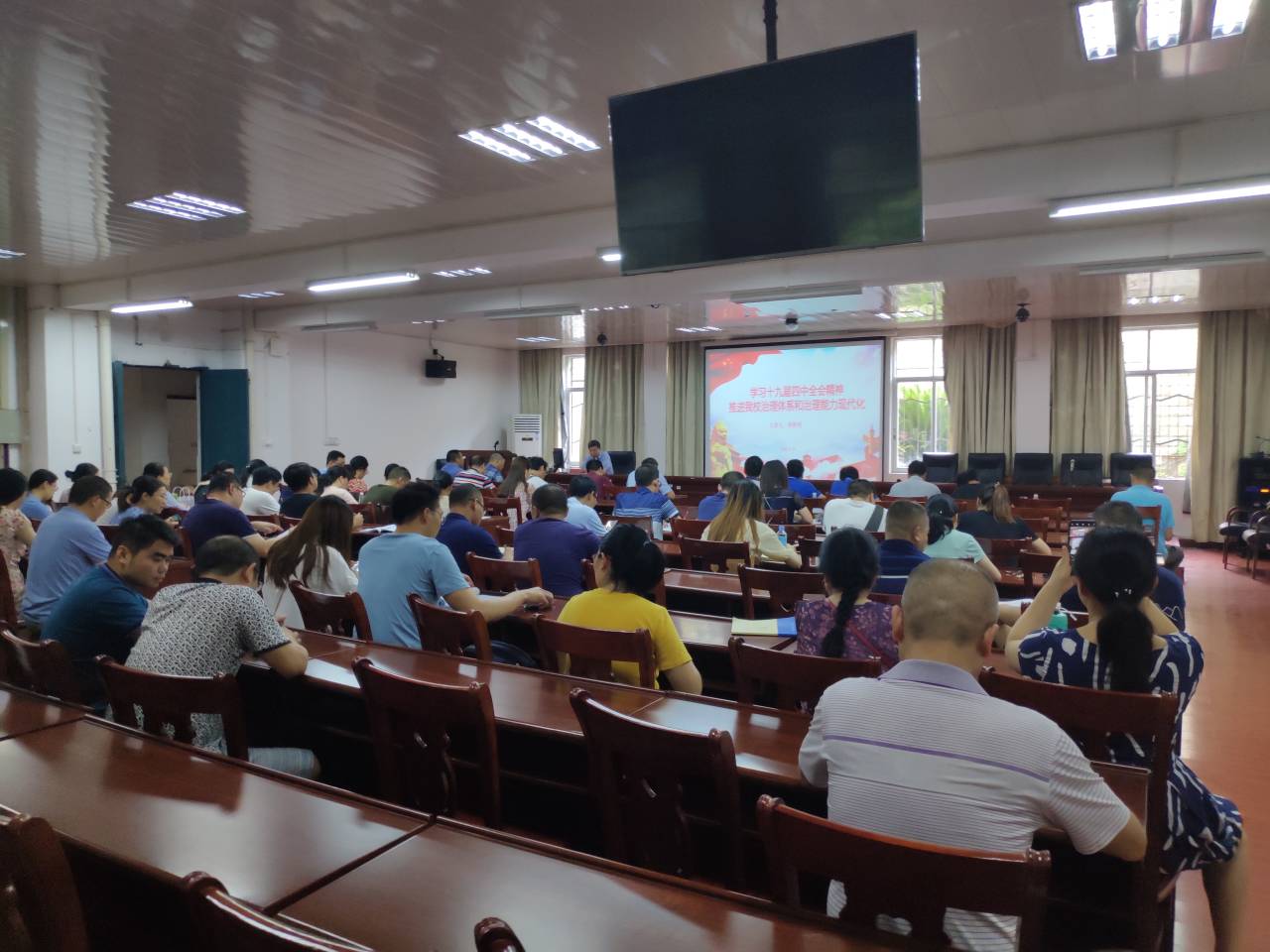 党委副书记唐艳明在知行楼为理学院和电信学院全体教师党员作题为“学习十九届四中全会精神  推进我校治理体系和治理能力现代化”的主题党课,党课由电信学院党总支书记陈泽顺主持。